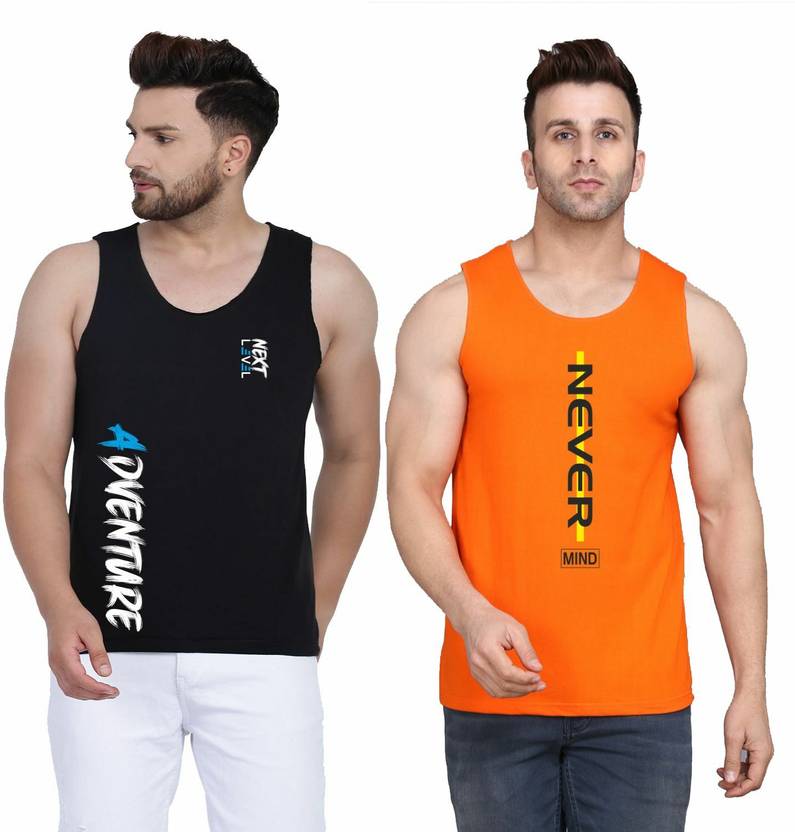 SLOWLORIS Pack of 2 Men Printed Round Neck Cotton Blend Black, Orange T-Shirt