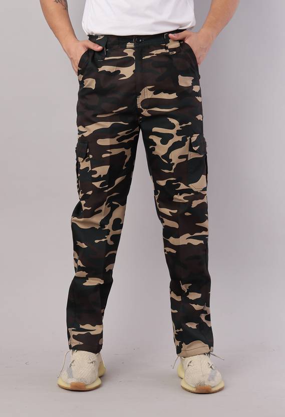 men's Army print Relaxed Fit Cargo Pants. regular fit gives you amazing comfort with latest stylish design. cargo pant with straight fit, soft polycotton fabric. has multiple pocket on the front and back, zip fly and button closure. Militry print cargo specially crafted for casual and travel wear.