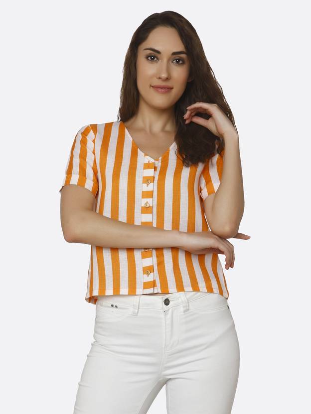 Add some stripes to your new season wardrobe with this Smarty Pants Top. Featuring a Orange striped and Linen material, loose fit and half sleeves, style it with jeans and heeled boots for a look we're loving. NOTE: The model is of height 5'.8" with Bust 33" and is wearing a Smarty Pants Top size 'S' from the Smarty Pants Garment Size chart.