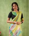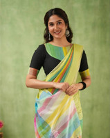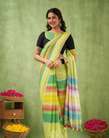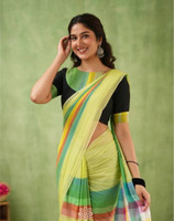 Complementing this saree, the unstitched blouse piece allows personalisation according to individual style. This blouse piece pairs well with the striped pattern, offering balance and simplicity. Moreover, tailoring it to fit personal measurements ensures both comfort and an impressive appearance. Thus, the combination of saree and blouse piece provides versatility while maintaining a coordinated outfit.