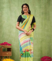 Radiating a subtle charm, this women’s saree features a striped pattern with pompom details that add a playful accent. The delicate pompoms along the borders enhance the overall appeal without overpowering the look. Additionally, the striped pattern creates a neat and structured look that drapes effortlessly.