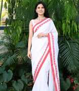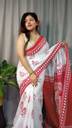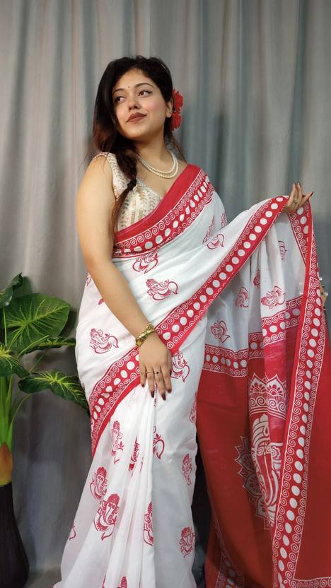 SMRITI HANDLOOM Digital Print Tant Handloom Pure Cotton Saree (White, Red)