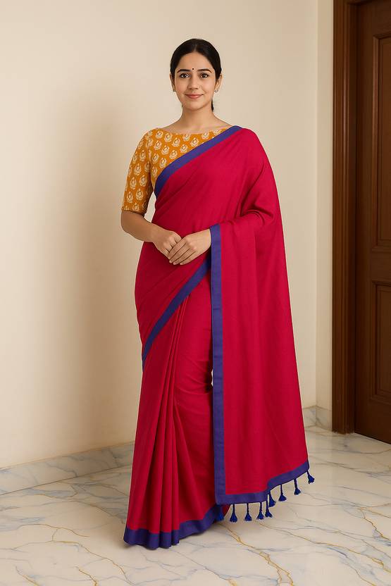 SMRITI HANDLOOM Solid/Plain Handloom Handloom Pure Cotton Saree (Pink, Blue)