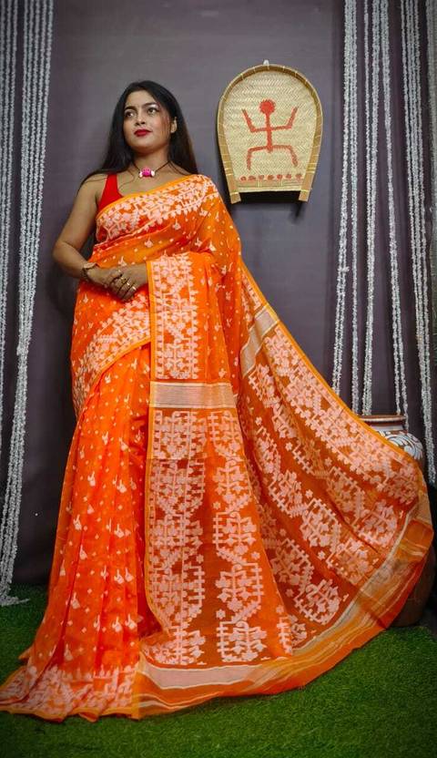 snehar Woven Jamdani Cotton Silk Saree (Orange)