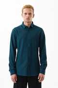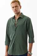 Slim Fit, Textured Weave, Dark Olive Green Hue, 97.2% Polyester, 2.8% Elastane Blend, Full Sleeve with Button Cuffs
