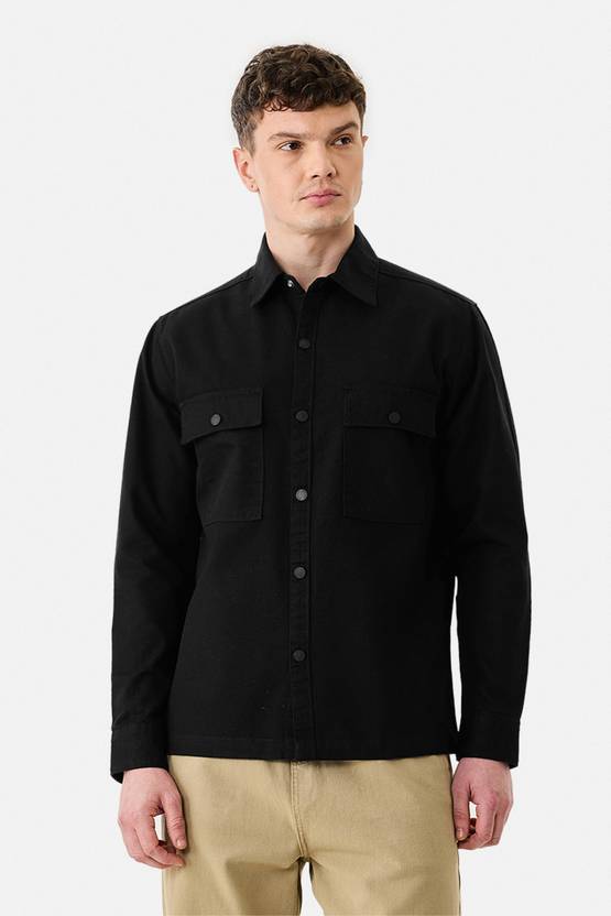 This relaxed-fit black overshirt is crafted from 100% cotton for breathable comfort. Featuring full sleeves, buttoned closure, and dual flap pockets, it’s a versatile layering piece for casual occasions. A stylish and durable wardrobe essential for effortless sophistication.