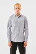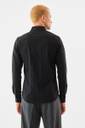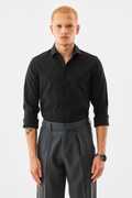 This slim-fit textured black shirt is crafted from 100% polyester for durability and a sleek finish. Featuring a wrinkle-resistant design, buttoned closure, and point collar, it is perfect for casual and semi-formal occasions. A stylish choice for men seeking comfort and sophistication.