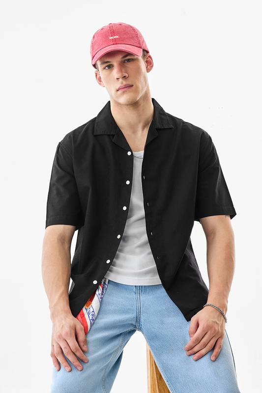This black Cuban collar shirt, crafted from a breathable cotton-linen blend, offers a box-fit silhouette for all-day comfort. Its lightweight fabric and short sleeves make it ideal for casual outings, while the solid design ensures versatile styling. A must-have for your summer wardrobe.