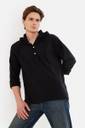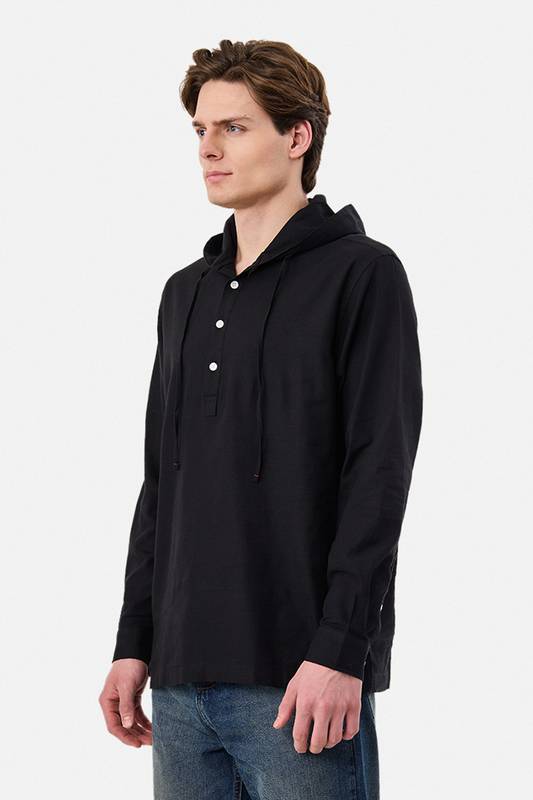 This black hooded shirt for men combines modern design with everyday practicality. Crafted from a breathable cotton linen blend, it features a three-button placket, rolled-up full sleeves, and a straight hem. Perfect for casual outings, this stylish shirt offers comfort and durability.