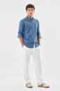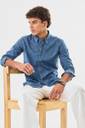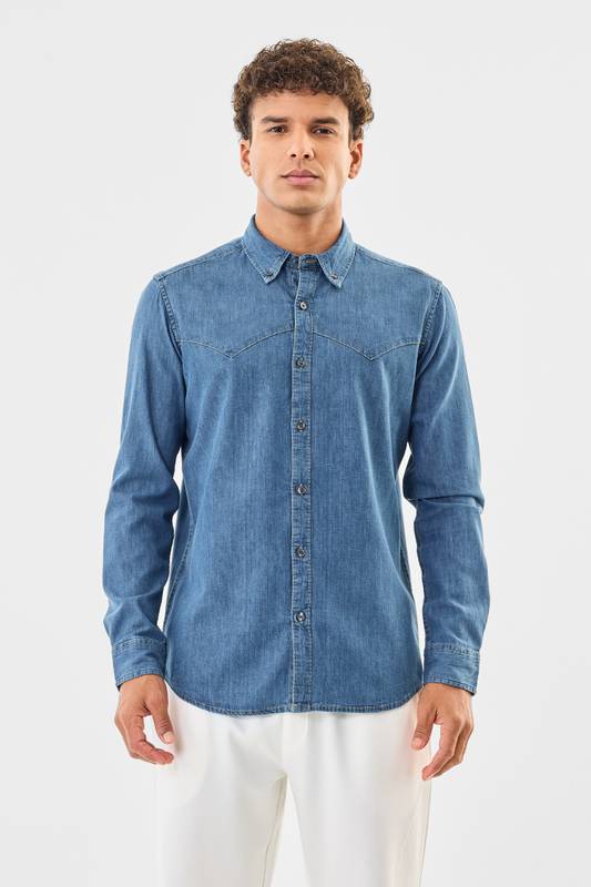 This men's regular fit denim shirt is crafted from 100% cotton for a breathable and comfortable feel. Featuring a solid pattern, button-down collar, and full sleeves with button cuffs, it offers a timeless look. Perfect for smart casual occasions, this shirt combines style and durability effortlessly.