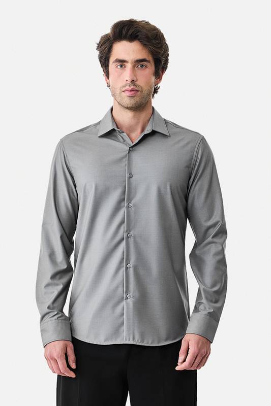 This light grey slim-fit shirt is crafted from a premium polyester-viscose blend, offering a smooth texture and wrinkle-resistant finish. Designed with a spread collar and button cuffs, it’s perfect for formal and smart-casual occasions, ensuring a polished and comfortable look.