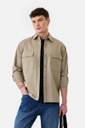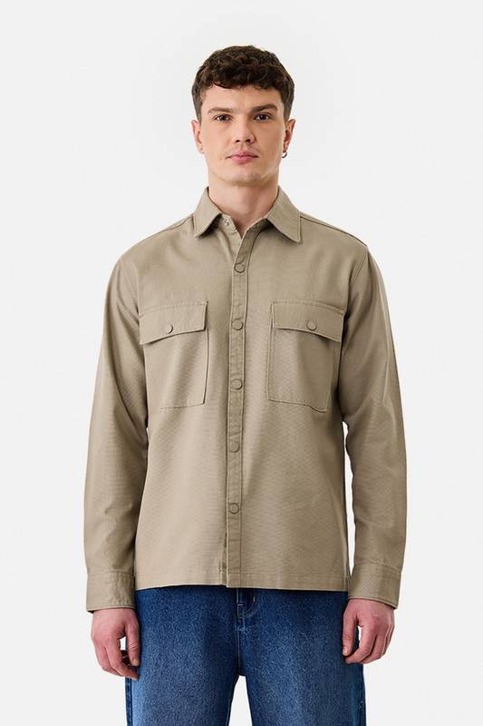 This Khaki Relaxed Fit Cotton Overshirt for Men is crafted from 100% breathable cotton, featuring dual flap pockets, a button-down front, and full sleeves. Its versatile design makes it perfect for casual wear or layering, offering both style and comfort.