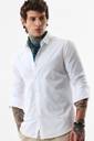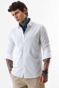 This slim-fit white cotton shirt combines style and comfort with its breathable fabric and classic design. Featuring a spread collar, full sleeves, and a curved hem, it’s perfect for both casual outings and formal occasions. A versatile wardrobe essential for effortless sophistication.