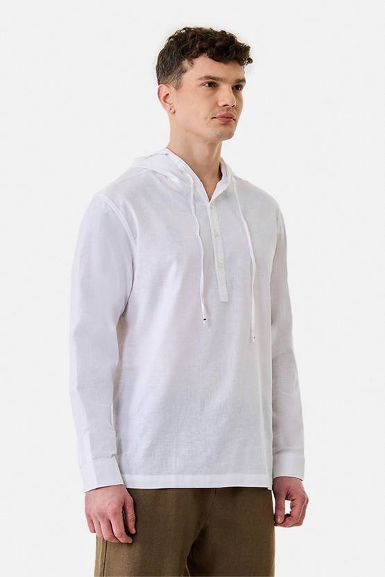 This white hooded shirt for men is crafted from a breathable cotton linen blend, offering a relaxed fit and lightweight feel. Featuring a buttoned placket, drawstring neckline, and solid pattern, it’s perfect for casual outings or smart-casual occasions. A versatile wardrobe essential.