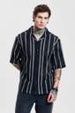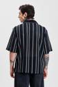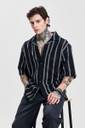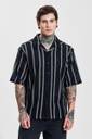 This men's oversized fit shirt features a breathable 100% cotton fabric with a striking black base and white vertical stripes. Designed with a Cuban collar and half sleeves, it offers a relaxed yet stylish look, perfect for casual outings or streetwear. The buttoned closure and straight hem add to its timeless appeal.