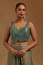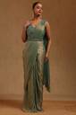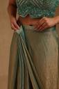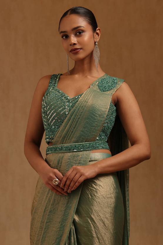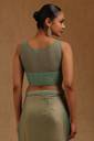 Make moments memorable with this teal green sarees. This carefully designed ensemble for effortless elegance. The top is crafted from premium organza, providing crisp structure with sheer elegance. The top is crafted with flattering neckline design. It is featuring sleeveless design for contemporary sophistication. This ensemble is perfect for traditional gatherings embracing heritage beauty. A perfect choice for ensuring every celebration becomes a testament to elegance.