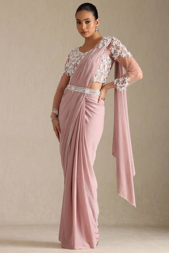 Soch Womens Blush Pink Nylon Blend Solid Ready To Wear Saree With Beads