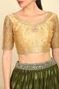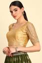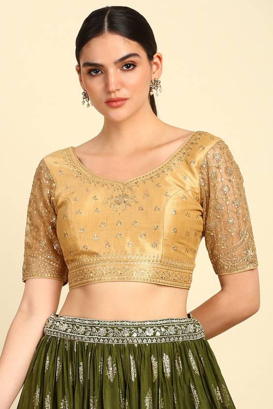 Glam up your luxury culture with this gold silk blend princess line cut padded blouse featured zari embroidered with sequins work, has leaf neck and short sleeves, secured with hook & eye back closure. This women's blouse can be paired with a variety of saree of your choice either contrasting or matching, and is ideal for evening wear, parties, and weddings.