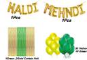 Haldi Mehndi Decoration Kit Set : 1 Pc Haldi +1 Pc Mehndi + 45 Pc HD Balloons (15 Green+30 Yellow ) + 2 Gold +1 Green Foil Curtain...Groom & Bride Haldi Mehndi Ceremony Decoration Kit