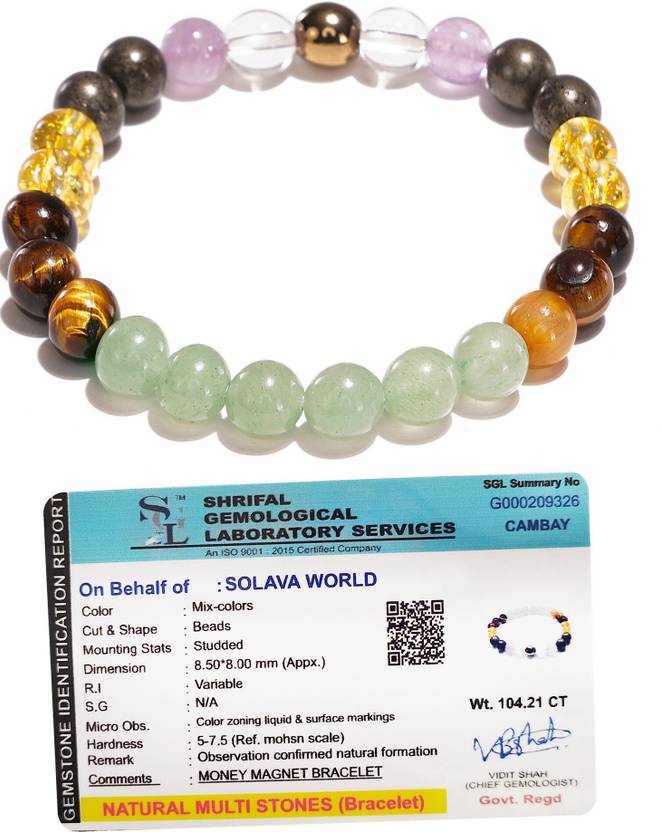 The Money Magnet crystal bracelet is carefully prepared using a combination of powerful and healing crystals, each chosen for its unique properties to enhance Money, Abundance, and Prosperity. The crystals used in these bracelets are pyrite, citrine, tiger eye, green aventurine, amethyst, and golden hematite. Pyrite stone which is known as "fool's gold," is a symbol of wealth and carries strong protective energies. Citrine, with its radiant golden hue, is associated with attracting financial success and positive energy. Tiger Eye increases confidence, stamina, and focus, helping to make the person strong and bold. Green Aventurine promotes luck and opportunity, while clear quartz amplifies the intentions and enhances mental clarity, Amethyst, a stone of spiritual wisdom, helps balance the mind and emotions, promoting a healthy relationship with money. Lastly, hematite provides grounding and stability, ensuring that the abundance attracted is sustainable. The Money Magnet bracelet for men and women has these special and powerful crystals that can help the wearer to get more money and make you financially strong. This money crystal stone bracelet acts as a powerful tool for attracting Money, Prosperity, and wealth. People who want money, fame, success, and luck can use this healing crystal money attract bracelet. The bracelet is super beneficial in attracting wealth, and silver and it can be used by anyone. It is considered a lucky healing bracelet due to its “Money-Attracting Nature”. It can be used by homemakers, service persons, business persons, farmers, men, women, and children. Money- Magnet bracelets help to protect the wearers against several negative energies and keep them focused, motivated, and financially independent. It can be used by men, women, girls, and boys irrespective of their age, gender, zodiac sign, rashi, or nakshatra.