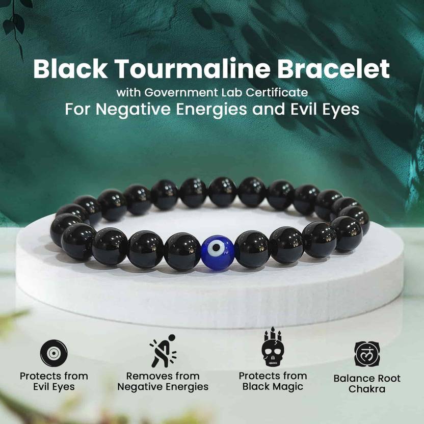 Original Black Tourmaline Bracelet with Lab Certificate for Men and Women with Evil Eye - Natural Energised Black beads, Evil Eye for Protection- 8MM Beads