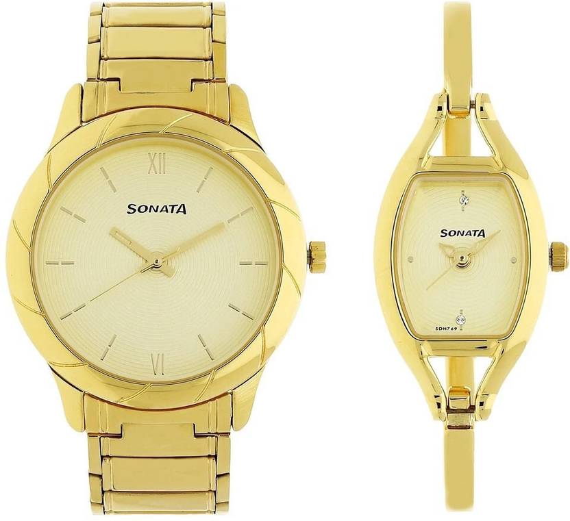SONATA Sonata Beige Dial Gold Stainless Steel Strap Couple Analog Watch - For Couple