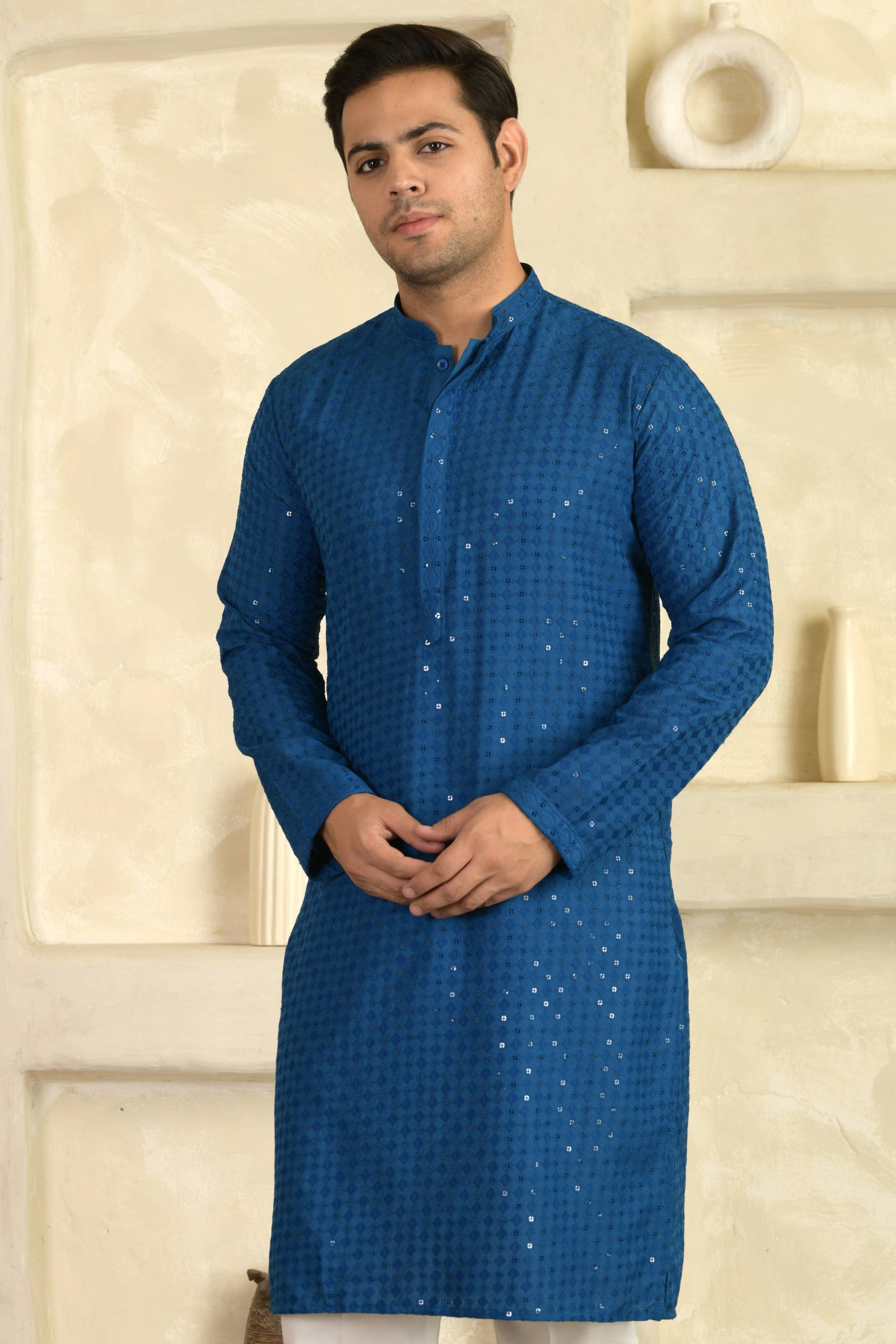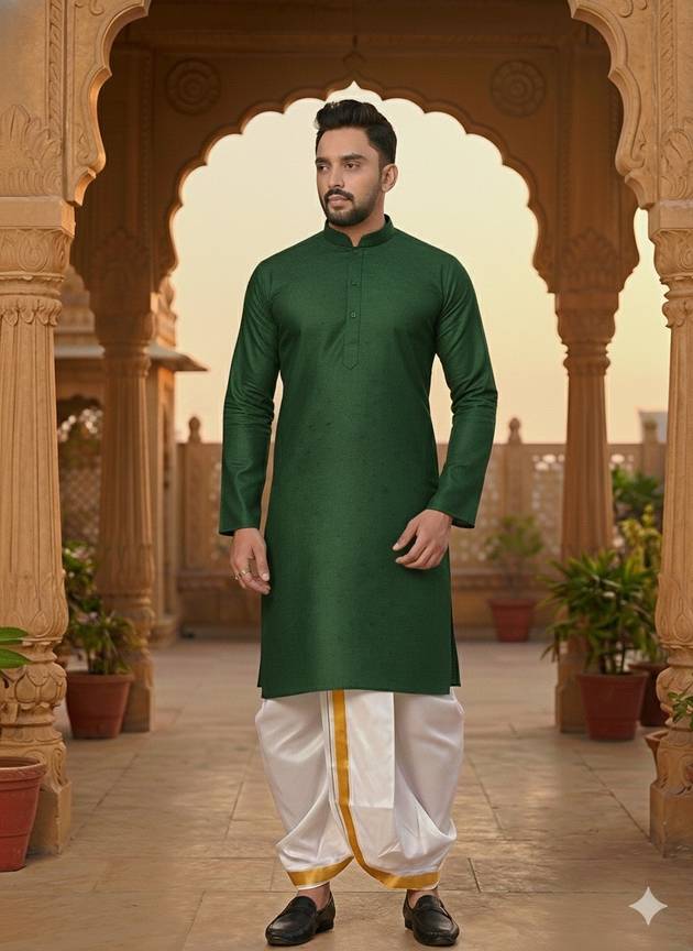 A men’s cotton-blend Kurta-Dhoti set is a traditional Indian ethnic outfit that includes a kurta (upper garment) and a dhoti (lower garment). The kurta is usually a knee-length or slightly above knee-length long shirt with long sleeves and a classic neckline (often a mandarin / Chinese collar or simple round/stand collar). The dhoti is a piece of cloth or stitched bottom that wraps around the waist and legs, giving a traditional draped appearance — but in modern sets it’s often stitched or tailored so that it’s easier to wear (without manual draping).