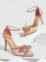 The bow adds a touch of femininity and charm, elevating the overall look. These sandals may have various strap styles, including ankle straps, T-straps, or simple toe straps, and can come in a variety of materials like leather, satin, or suede. The heel could range from a stiletto to a block heel, depending on the style's desired level of comfort and sophistication.