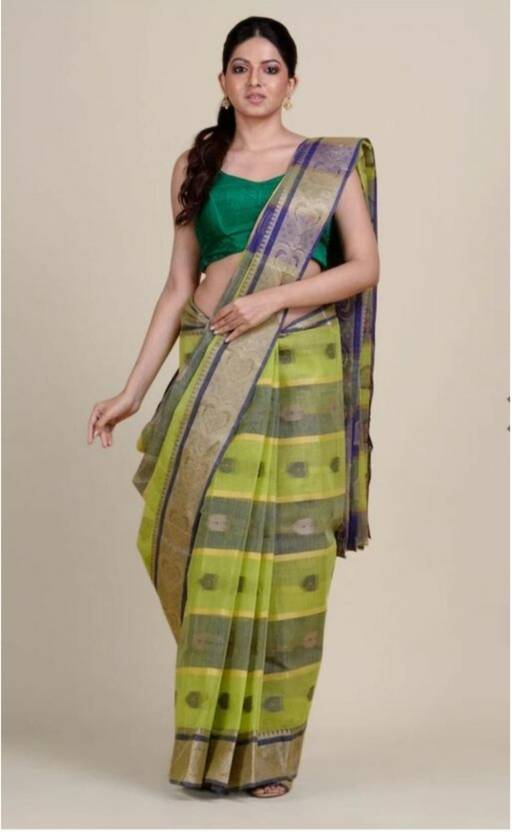 sourav biswas Self Design Tant Pure Cotton Saree (Green, Blue)