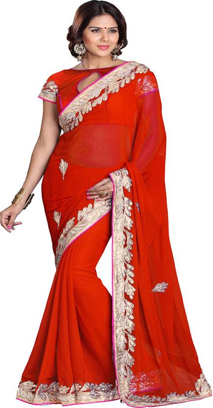 Make a stunning entrance floating in this delicate red chiffon indian party wear saree. This saree comes with an attached art silk blouse fabric which can be customised from 32" to 42". Blouses with elaborate patterns and colors are used for photo-shoot. Color and pattern of the blouse might not be as shown in the image. (slight variation in color, design and patch border work is possible)