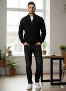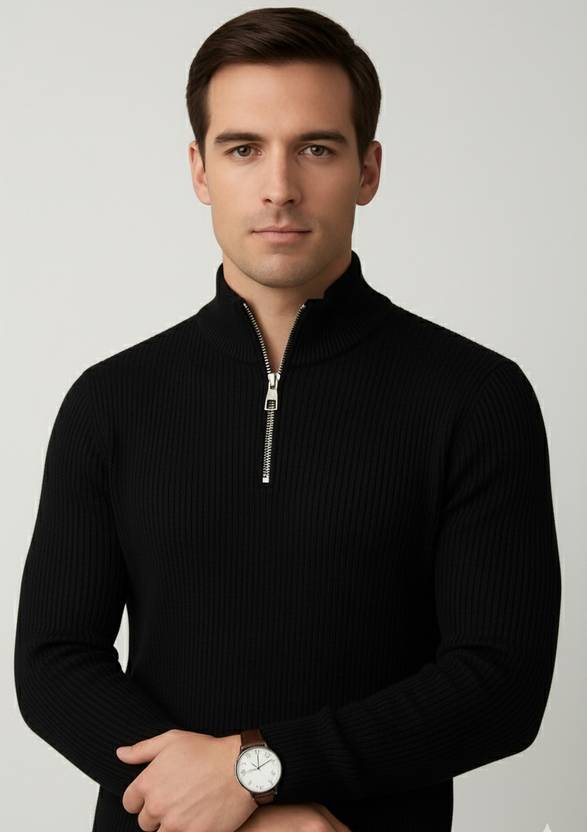 Mens's Half Zipper Pullover T-Shirt | Solid Colour Rib-Knit Full Sleeve Winter Wear | Casual Standing Collar Sweatshirt for Men