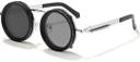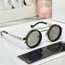 These distinctive sunglasses showcase round lenses encased in thick black frames, complemented by sleek gold-toned temple arms with intricate detailing reminiscent of classic Steampunk aesthetics. The unique construction combines durability with fashion-forward design elements, making them perfect for those who appreciate both style substance.