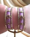 A soft pastel lavender thread bangle set featuring square flower motifs and white dazzling accents. Designed for women who prefer subtle elegance, this set pairs beautifully with light-colored outfits and modern ethnic wear.