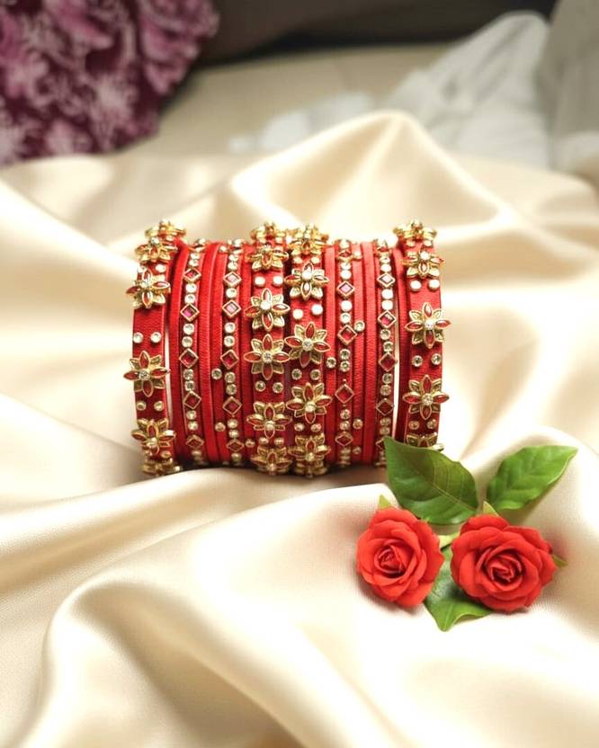 This handcrafted floral thread bangle set features a balanced combination of 2-cut, 4-cut, and 8-cut bangles designed to create an elegant layered look. The set includes a prominent floral motif, designer cut bangles, and spacer bangles to maintain visual harmony. Ideal for daily wear, festive occasions, and gifting.