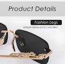 The SpectaSwag Wildcard Combo is a bold statement piece that blends high fashion with a fierce, untamed spirit. This combo features two pairs of rimless sunglasses, each with a striking panther head design on the temples, a symbol of power and confidence. One pair showcases a sleek black lens for a classic, mysterious look, while the other features a warm tea-colored lens perfect for a softer, more sophisticated vibe. The lightweight gold frame and UV400 protection make these sunglasses as practical as they are stylish.