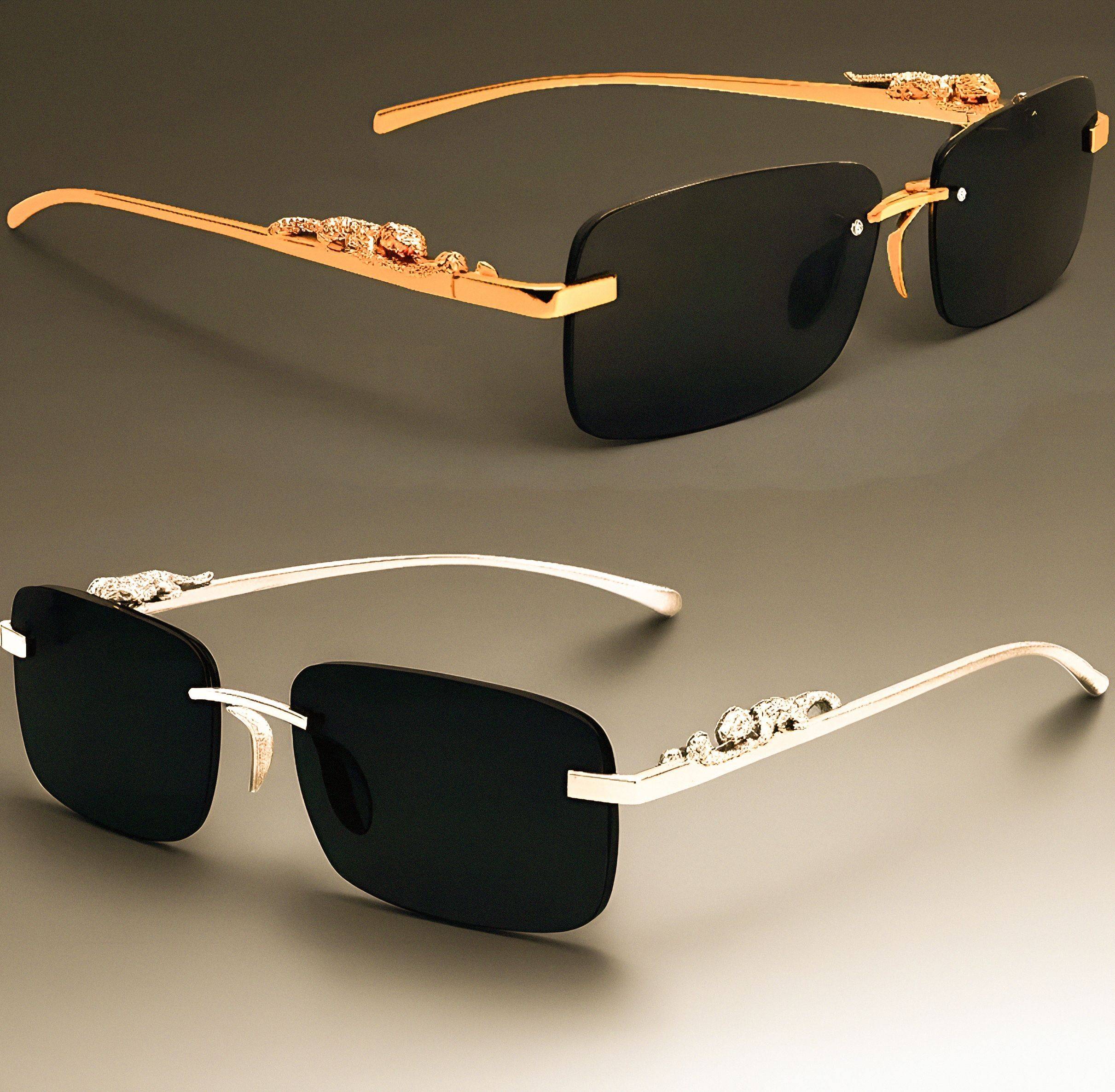 Upgrade your fashion game with these premium luxury rimless sunglasses designed for both men and women. Featuring a stylish panther design on the temples, these shades come in gold and silver frame options that add a touch of royalty to your look. The high-quality UV protection black lenses keep your eyes safe from harmful rays while giving you a bold and modern appearance.