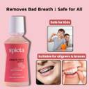 | Key Features | - REFRESHING BREATH: Peach Mint Mouthwash offers a refreshing blend of Peach, Green Tea extracts and Mint flavors, providing a pleasant experience for users during oral hygiene routines., HERBAL & NATURAL: Formulated without alcohol, fluoride, and SLS (Sodium Lauryl Sulfate), making it suitable for individuals with sensitivities or preferences for natural ingredients., NO MORE CAVITIES: Designed for fresh breath, this mouthwash helps in teeth whitening, prevents cavities, removes bad breath, and promotes overall oral health for both adults and children., ANTIBACTERIAL PROPERTIES OF Green Tea: Green Tea has antimicrobial properties that can help fight oral bacteria, reducing the risk of plaque formation, tartar, cavities, and gum disease whilst being Vegan., GOODNESS OF FITKARI: Natural antiseptic properties help in fighting bacteria and preventing oral infections. Helps in tightening gums and reducing gum bleeding. Does not cause dryness or discomfort commonly associated with alcohol-based products.