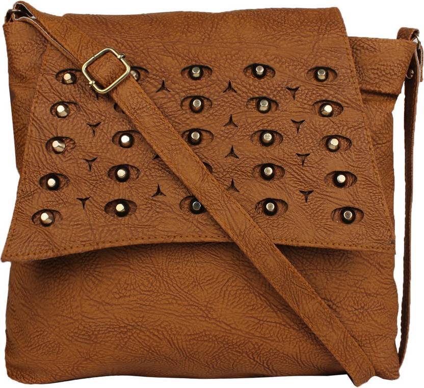 Tan Women Sling Bag - Extra Large Cutwork Golden Button