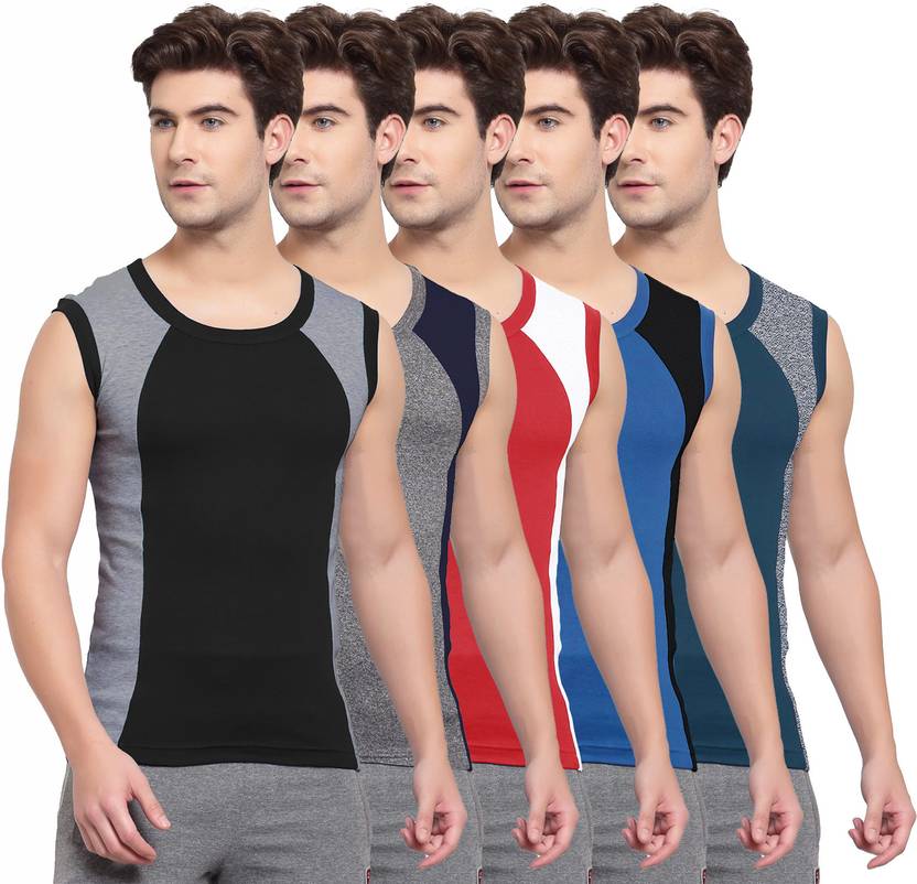 Men's Cotton Solid Multicolor Square Neck Sleeveless Gym Vest - Pack of 5 (#1051). . 100% Super Combed Cotton, Ribbed Fabric Scoop Neck, Sleeveless Vest, Broad shoulder.