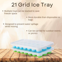 Featuring a versatile, up to 21-grid layout, this ice cube tray can help produce numerous uniformly shaped cubes simultaneously, ensuring consistent size for various uses. Its intelligent design allows for easy stacking of multiple trays, maximising freezer space efficiency. Crafted to prevent water spillage during transportation, it also helps maintain a clean and organised freezer environment.