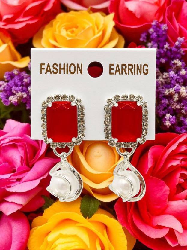 Add a touch of elegance and sparkle to your style with these stunning ruby red crystal earrings. The top features a bold rectangular red stone bordered with shimmering white crystals, while the bottom showcases a beautiful pearl drop encased in a delicate silver swirl design. These earrings are lightweight, comfortable, and perfect for both traditional and western outfits.