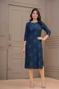 Featuring a round neck with tasteful detailing and 3/4 sleeves, this kurta brings together subtle sophistication and functional design. The neckline frames your face beautifully while offering plenty of room for accessorising with earrings or necklaces of your choice.