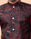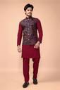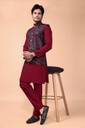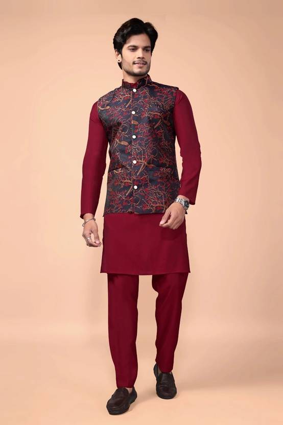 STYLE ELEMENTS: Elegant 3-piece ensemble featuring a maroon kurta, matching bottoms, and a sophisticated Jacquard printed Nehru jacket with intricate red patterns