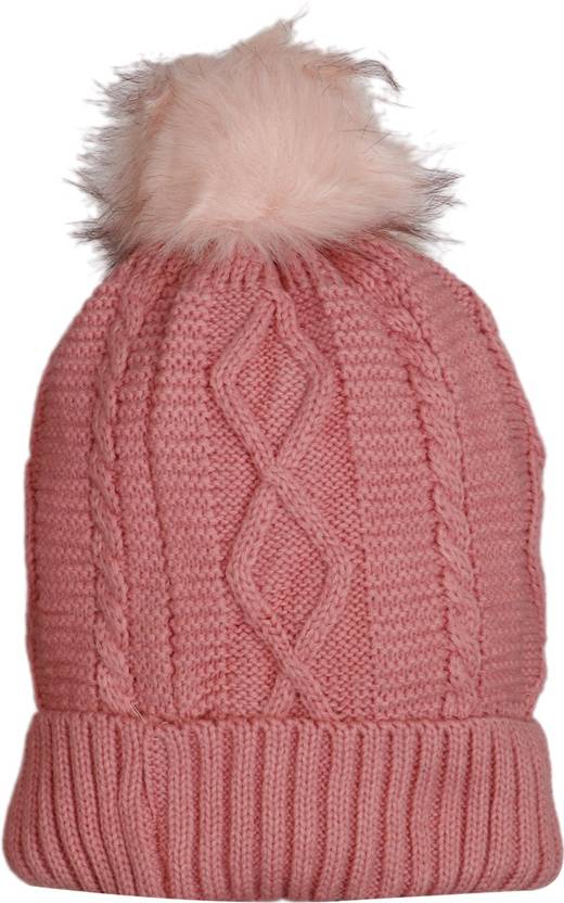Pink POM POM Checks Woven Stylish Woolen Fur Beanie Cap