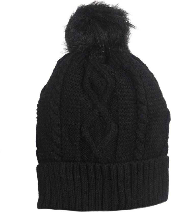 Black POM POM Checks Woven Stylish Woolen Fur Beanie Cap