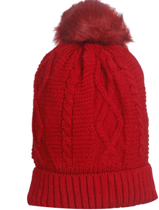 Red POM POM Checks Woven Stylish Woolen Fur Beanie Cap