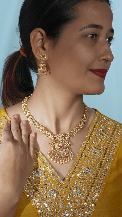 Featuring an ethnic design, this jewel set reflects a rich cultural heritage that pairs gracefully with traditional attire. The intricate patterns lend a timeless elegance, adding charm to various occasions. From weddings to festive celebrations and formal gatherings, this set brings a sophisticated touch to any outfit.
