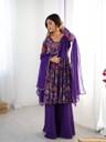 The matching palazzo pants, crafted from the same pure Romansilk Chanderi fabric, are fully stitched and free-size, offering ease and flow with 4 meters of total flair. The outfit is paired with a stunning 2.2-meter dupatta made from pure soft tabby organza, adorned with fancy lace borders that add charm and elegance.