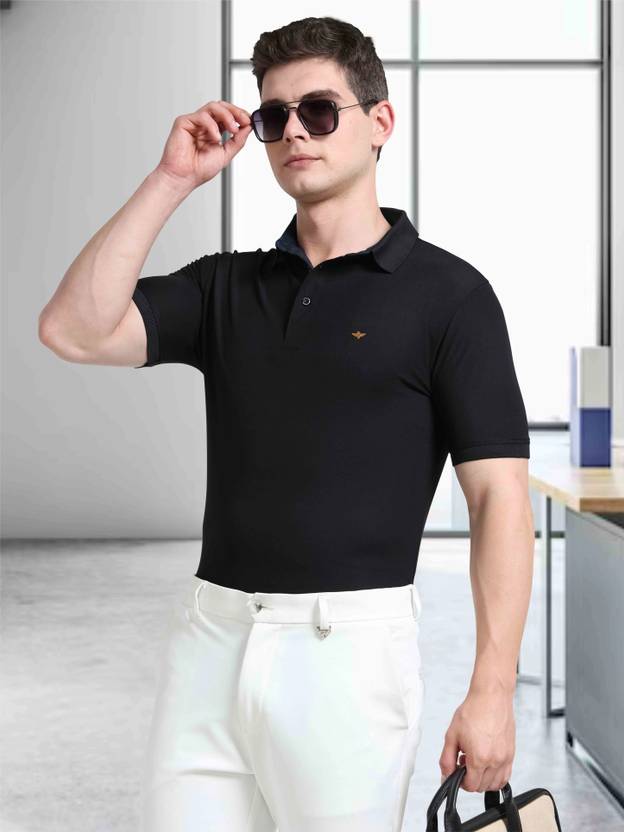Stellers Men Solid Polo Neck Polyester Black T-Shirt