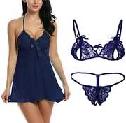 STEPHY Babydoll Lingerie Dress will make your nights special and peaceful. The smooth Spandex finish sliding against your skin makes you very comfortable and the beautiful design which is unique in style makes you look more feminine and appealing. SHOW OFF YOUR CURVES in this attractive see through lingerie night gown extending to or just over the hips, which flatters body shape and make you look hotter and will set your partner's pulse racing. This Baby doll lingerie comes in beautiful colours, so pick your favourite colour. Free size with cozy and comfortable feel and fit 28 to 36 inch bust. The unique design of this short night dress & Lingerie Set makes it desirable. Package Content: 2 Set* (1 Baby doll short dress With G string panty & 1 Bra Panty Set). This nightwear style is comfortable yet arouses a sense of romanticism. For young and newly married women, baby doll lingerie designs are a must in their trousseau as they bring that magic to those beautiful romantic nights. With many designs, fabric, and styles, baby doll lingerie makes you look and feel attractive. When it comes to investing in a baby doll style of lingerie, a popular choice in this category is the combination of satin and lace. Here are some top picks of such lingerie pieces for you to add to your night wardrobe collection.
